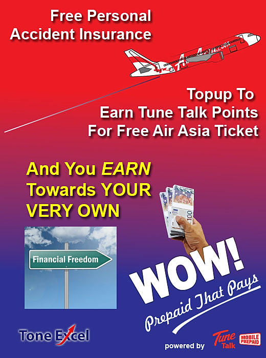 现在,让我告诉你有电话就有收入的方法!让我介绍连同AirAsia 和 Celcom 合作的预付卡电话线公司- Tone Excel计划。
